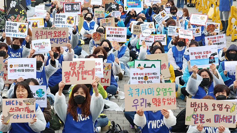 People rally in front of the Yongsan Presidential Office in Seoul, South Korea, to urge Japan not to discharge the treated wastewater from the Fukushima nuclear plant into the sea, April 6, 2023. /CFP