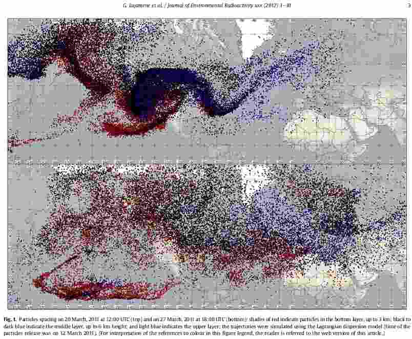 “A single release of 1015 Bq of 137Cs, which occurred on March 12, 2011 from damaged Fukushima NPP was analyzed. The initial plume height, as a result of initial vertical velocity and buoyancy, was kept to be at 2000e3000 m. The meteorological data and simulated trajectories revealed that the arrival times of particles released on 11 March, 2011 and 12 March, 2011 were different, and the particles were transported at different altitudes. It was also obvious that the jet stream affected the transport of emitted particles at upper atmospheric levels. Examples of the trajectories simulated using the Lagrangian dispersion model show (Fig. 1) that the first signs of Fukushima released radionuclides could be detected in the European countries (e.g. Island) on 20 March, 2011.”