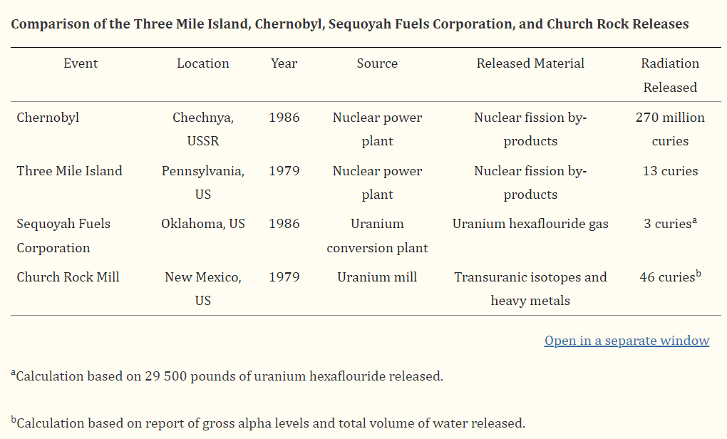 Like Sequoyah Fuels Corporation, the Church Rock spill occurred in a low-income, rural, American Indian area, albeit closer to a substantial secondary city, Gallup, NM, which has large Hispanic and White populations. Because the spill happened in the immediate aftermath of nationwide coverage of the Three Mile Island release, the muted coverage and response is particularly striking. It is not clear that there was acute harm from the Church Rock spill, so like Three Mile Island, the main concern is the development of disease over time after exposure. Compared with Sequoyah Fuels Corporation, the Church Rock spill contained more radioactivity because the tailings included radium, thorium, and other uranium decay products that have relatively high specific activities. In contrast to Three Mile Island, the population near Church Rock was already chronically exposed to uranium mine and mill waste through both occupational and environmental routes and continues to be exposed today.38