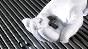 Fuel fabrication is the last step in the process of turning uranium into nuclear fuel rods. The enriched uranium is converted into fuel “pellets” and placed into thin metal rods. Each rod joins hundreds of others in a bundle called a fuel “assembly” to be loaded into the reactor core of the nuclear power plant.